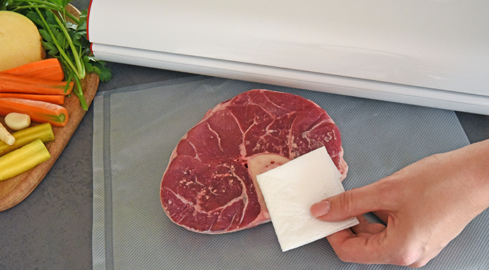 Za najbolje rezultate savjetujemo da meso i ribe prije vakuumiranja zamrznete na 1 do 2 sata. Tako će zadržati sok i oblik, a vrećica će biti bolje zaštićena. Ako prethodno zamrzavanje nije moguće, stavite između hrane i vrha vrećice papirnatu maramicu tako da maramica ne bude na mjestu zavarivanja. Maramica će tijekom procesa vakuumiranja upiti suvišnu vlagu i sokove. Upozorenje: Govedina može nakon vakuumiranja izgledati tamnije zbog uklonjenog kisika. To ne utječe na njezinu kvalitetu.