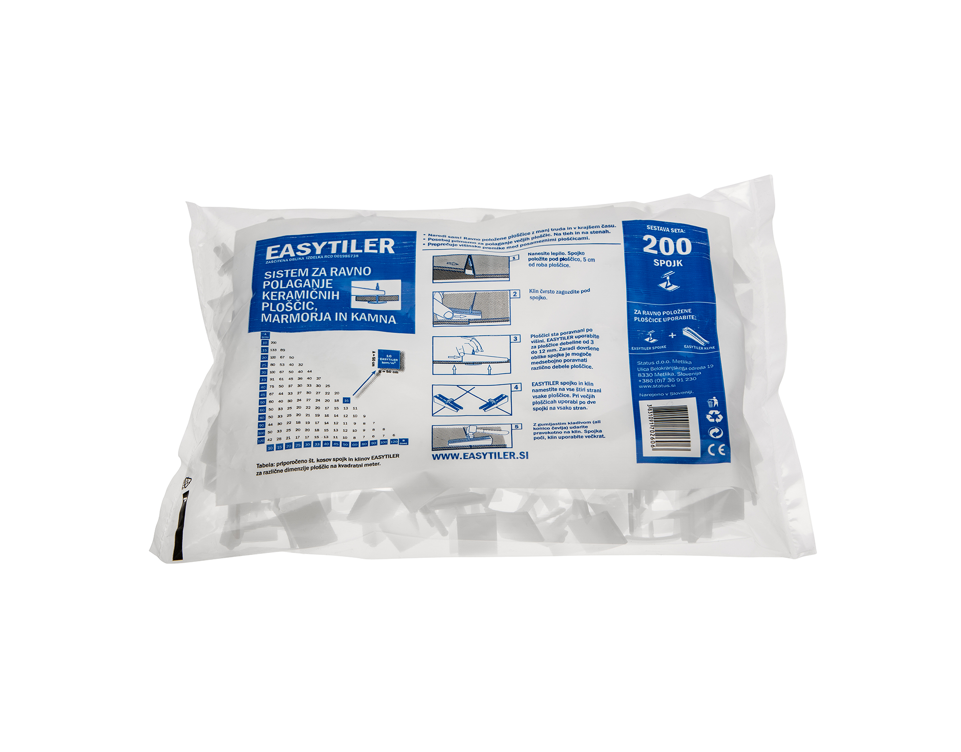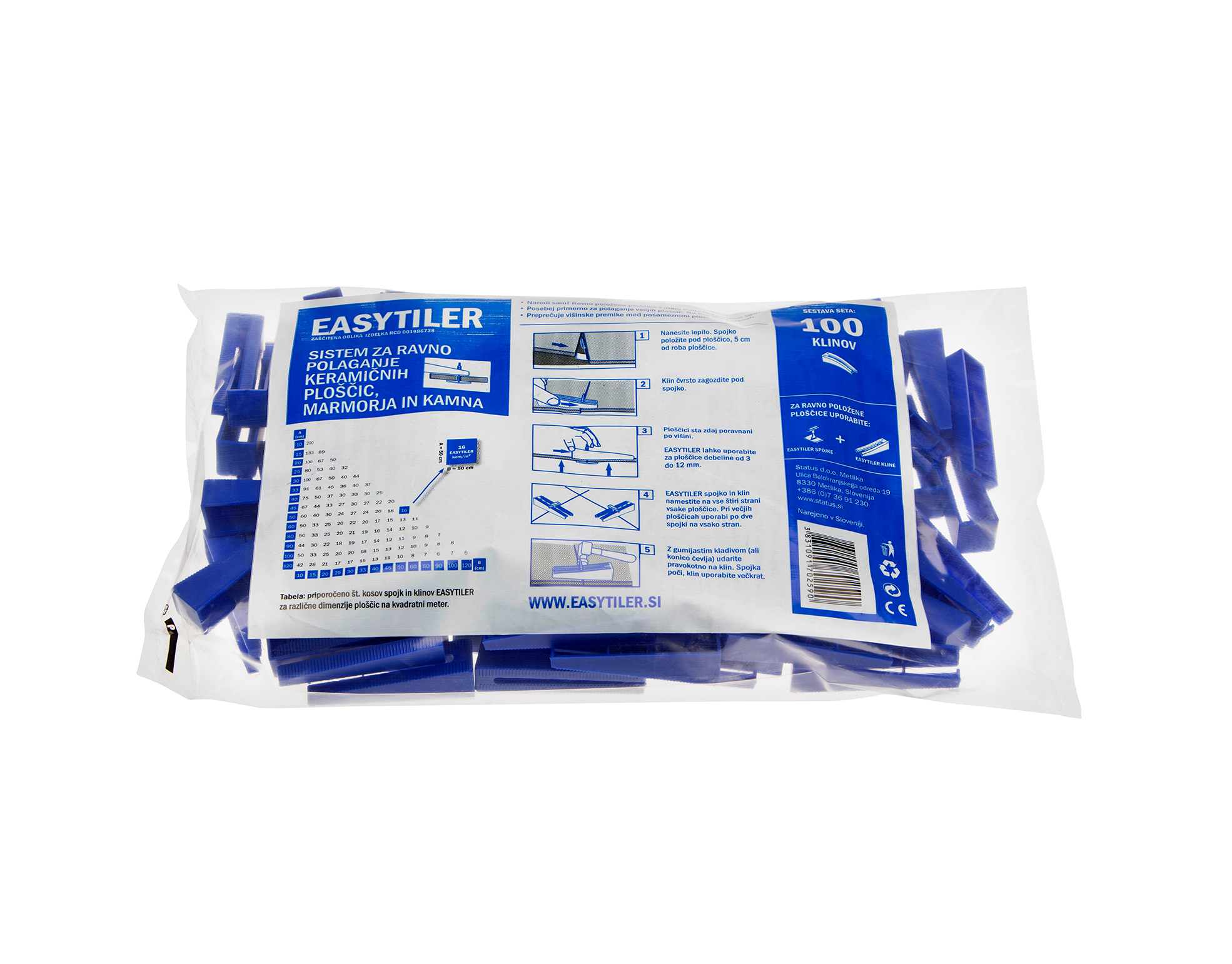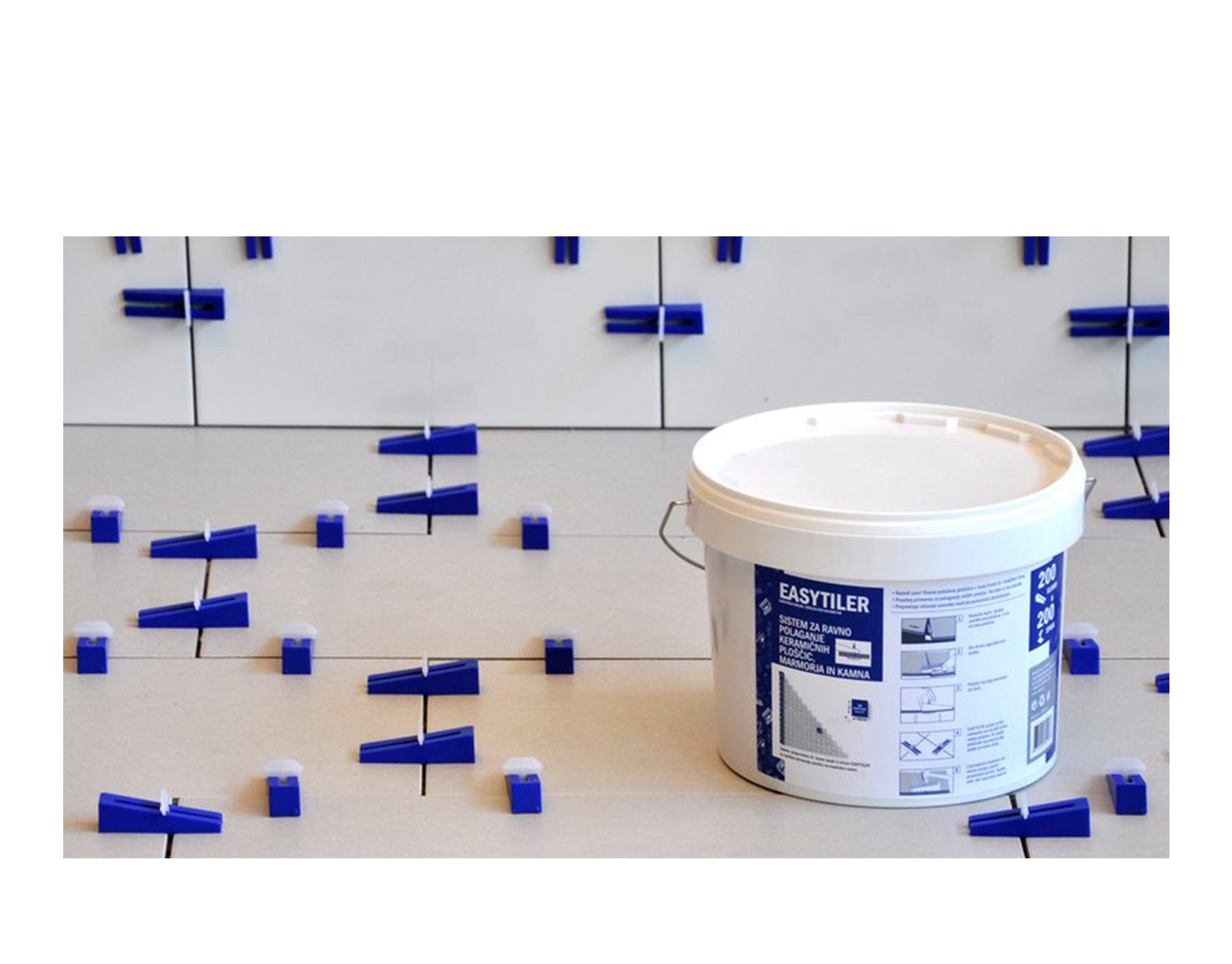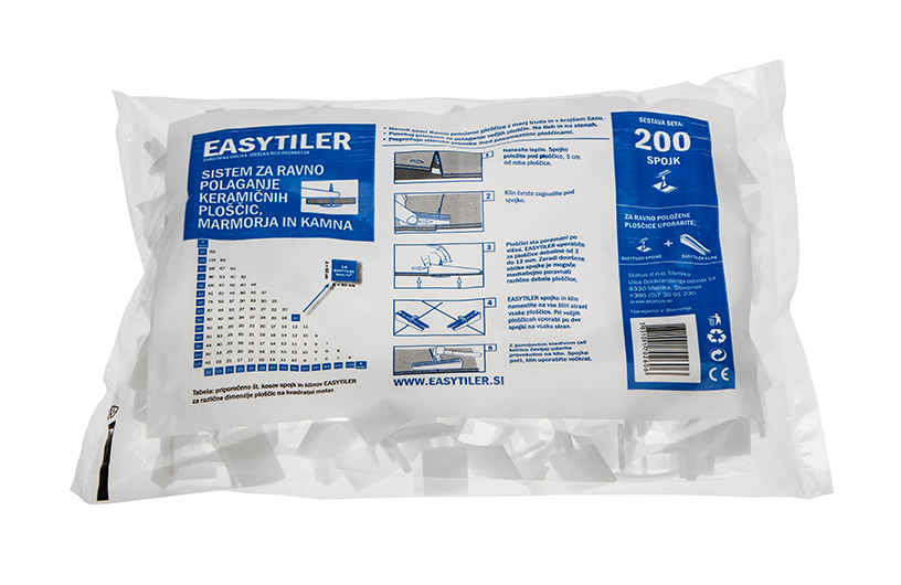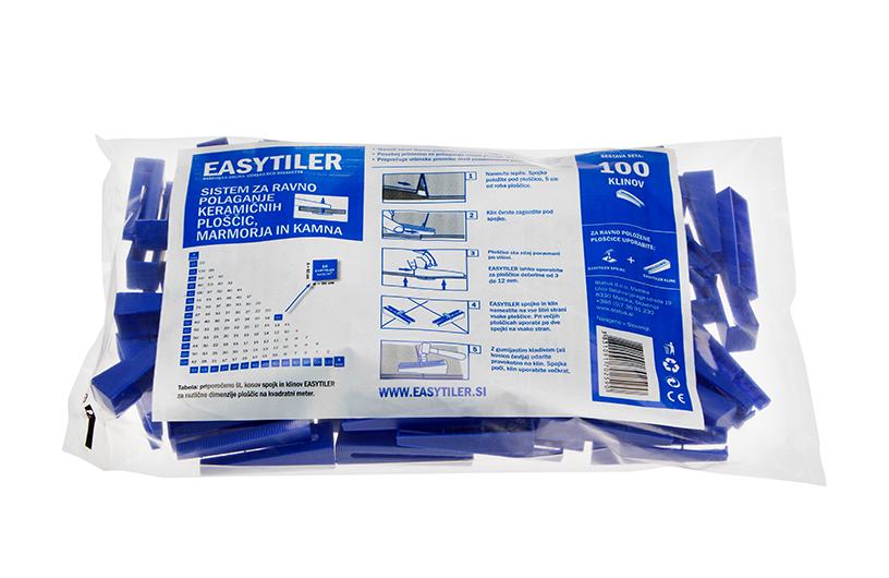 - Klinovi (200 kom) osiguravaju da ostanu susjedne pločice potpuno poravnate, dok se ljepilo ili mort ne osuši. Mogu se koristiti više puta.