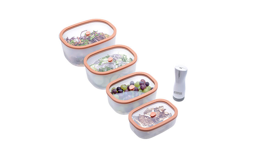 Promišljen dizajn Fresko posuda omogućuje optimalno iskorištavanje prostora u kuhinji. Pune Fresko posude složite jednu na drugu, a prazne pospremite jednu u drugu. Vakuumska pumpica je kompatibilna sa svim vakuumskih posudama Status.