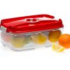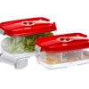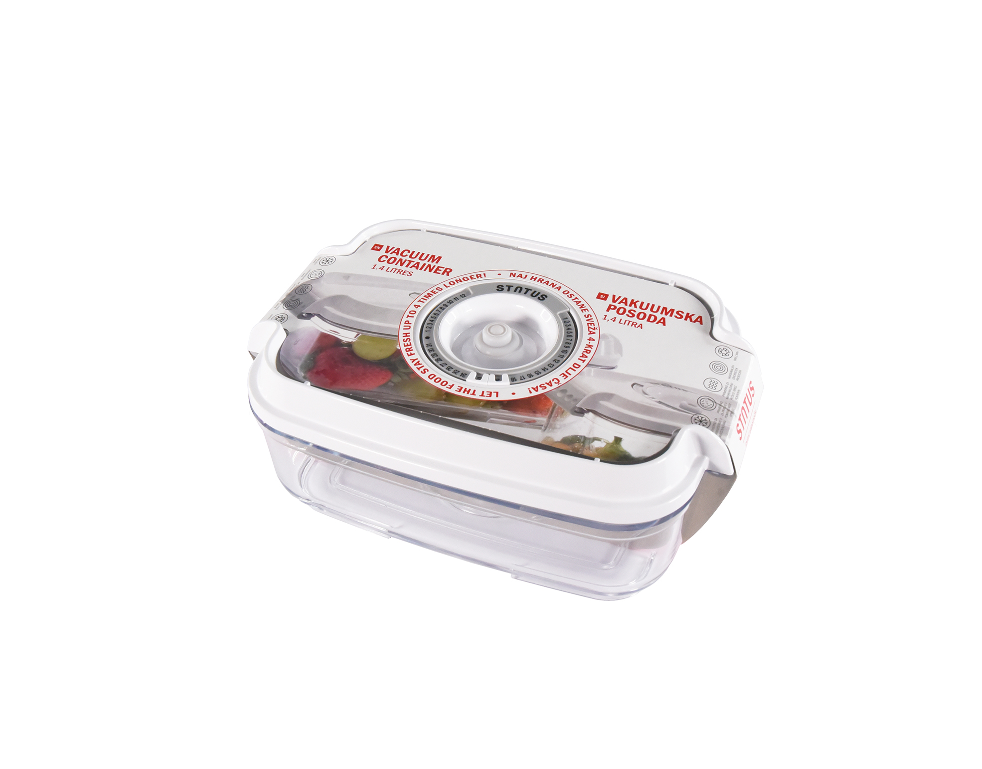 - oblik posuda i poklopaca prilagođen je za optimalno iskorištavanje prostora u hladnjaku i kuhinjskim ormarićima. Posude možete složiti jednu do druge i jednu na drugu. 1,4 litarska posuda na vakuum po dužini i širini odgovara 2-litarskoj, tako da ih možete spremiti jednu na drugu.