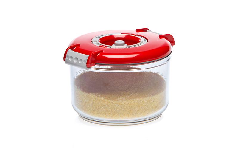 - Okrugla vakuumska posuda volumena 1,5 litra dovoljno je velika za vakuumiranje tjestenine i riže, pahuljica, brašna, suhog voća i slično.
