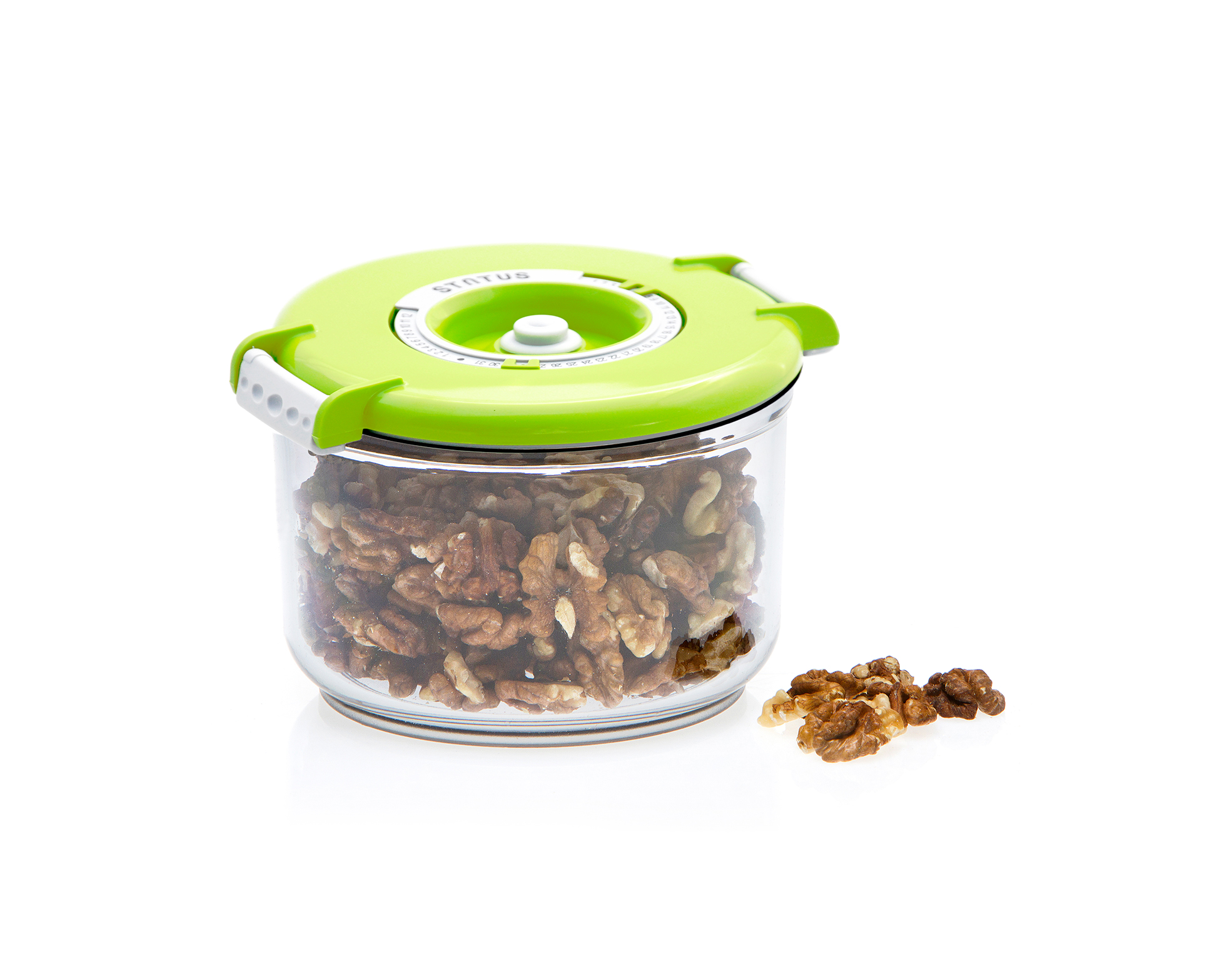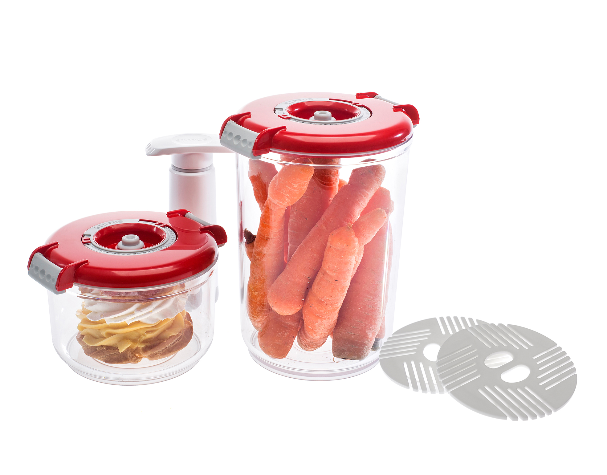 Set okruglih vakuumskih posuda Status prikladan je i za manje kuhinje, gdje ste ograničeni prostorom namijenjenim za pohranu hrane. Okrugle vakuumske posude jednostavno slažite jednu na drugu i maksimalno iskoristite prostor u hladnjaku, zamrzivaču ili na pultu.