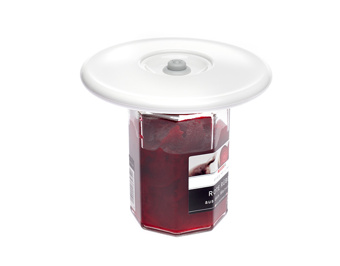 S univerzalnim vakuumskim poklopom promjera 13,5 centimetara zatvorit ćete posude promjera od 6 do 12 centimetara – od manje staklenke za marmeladu i konzerviranog povrća do zdjelica za pahuljice i lončića za zagrijavanje. Potrebno vam je samo vakuumski poklop i pumpa.