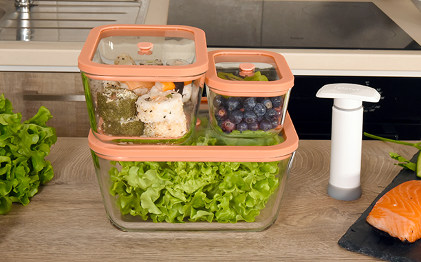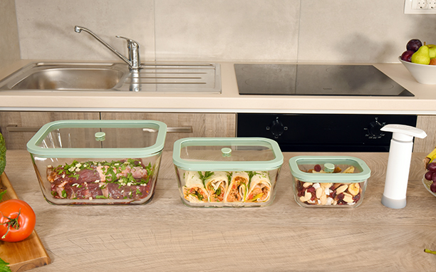 Viva set staklenih posuda je odličan za pripremu tjednih obroka. Vakuumski pohranjena jela su i nakon nekoliko dana pohranjivanja ukusna, svježa i hranjiva. Vakuum sprječava oksidaciju te time održava svježinu i postojanost hrane.