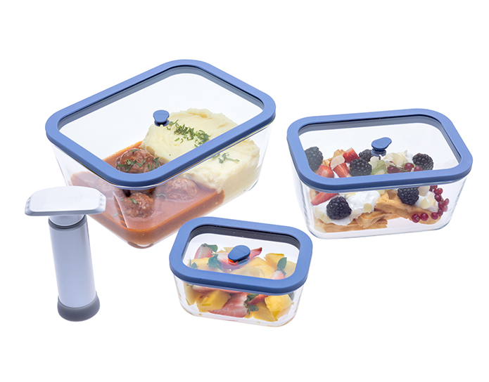 Viva staklene posude za vakuumiranje su praktične za sva kućanstva – od pripreme obroka u jednoj posudi do spremanja ostataka jela – za manje bacanja hrane. Pri oblikovanju posuda pobrinuli smo se da optimalno iskoriste prostor u kuhinjskim ormarićima. Prazne posude se pospremaju jedna u drugu, pune se slažu jedna na drugu.